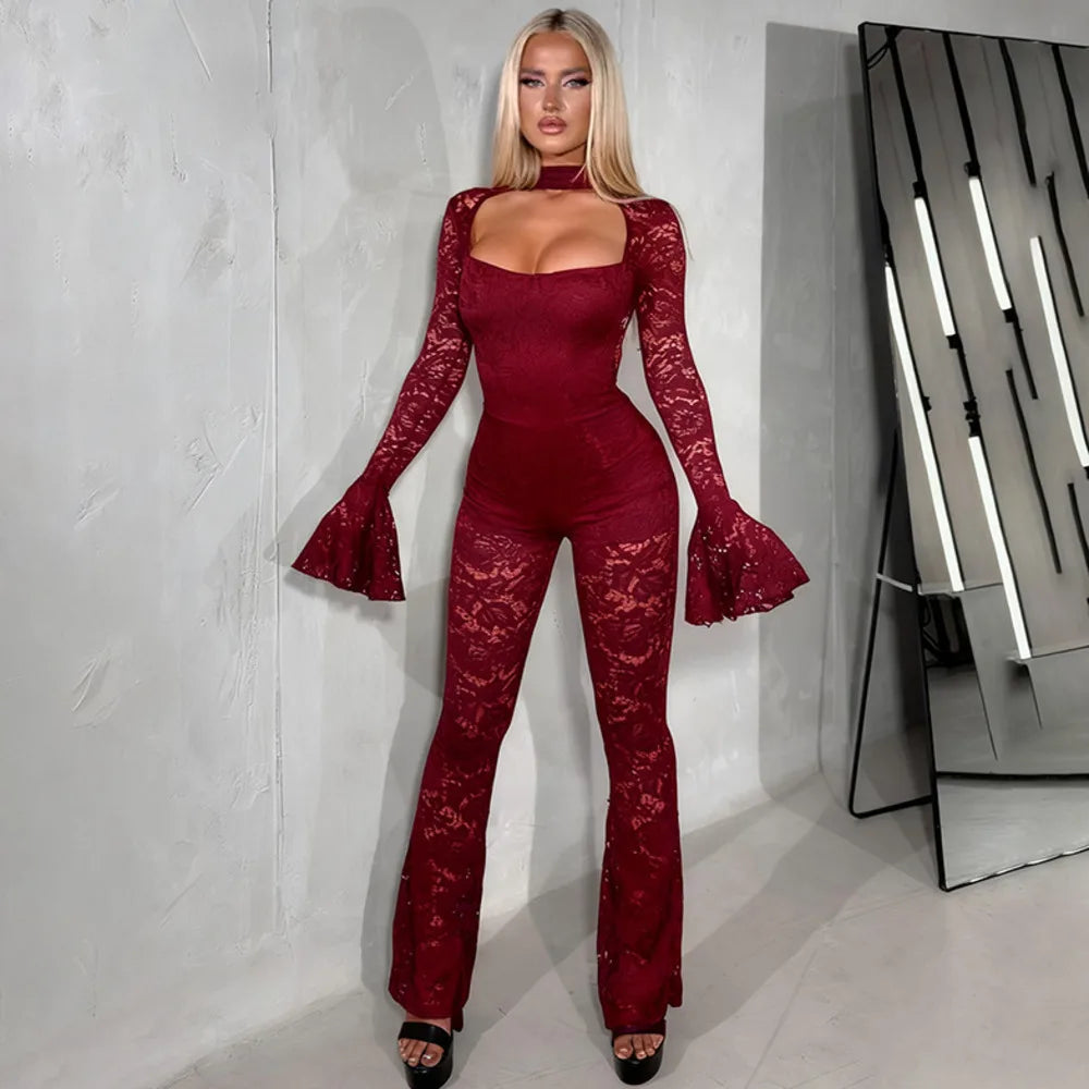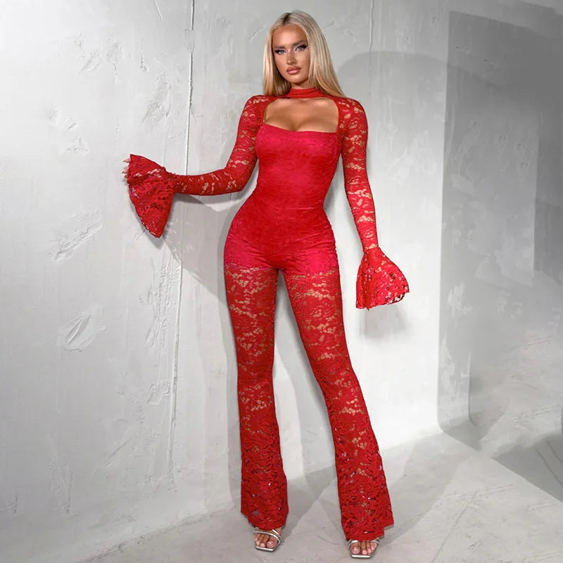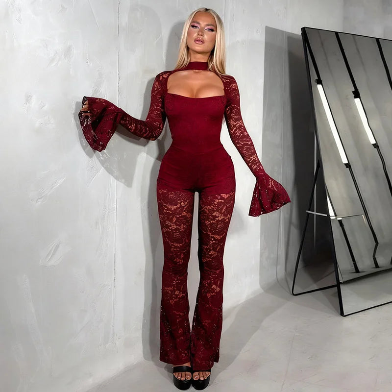 אוברול מחטב בגזרה גבוהה עם פרטים תחרה מרהיבים, עיצוב נשי ואלגנטי שמדגיש כל קימור. מכנס מתרחב באורך קרסול לסטייל זוהר ומקצועי.