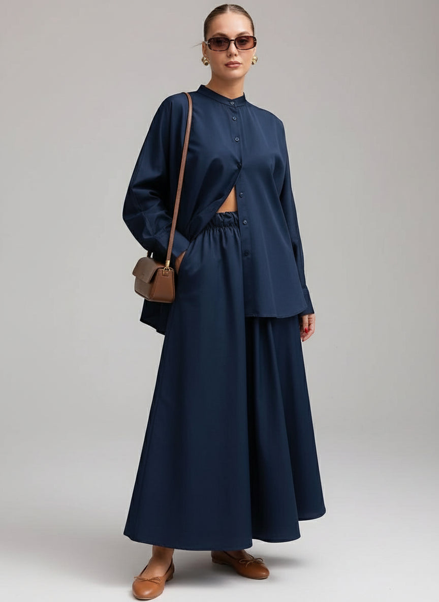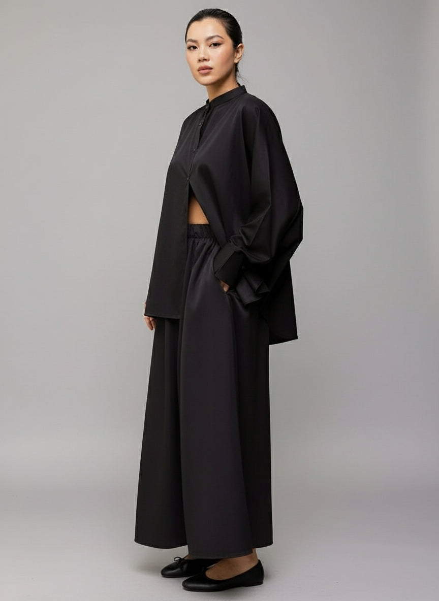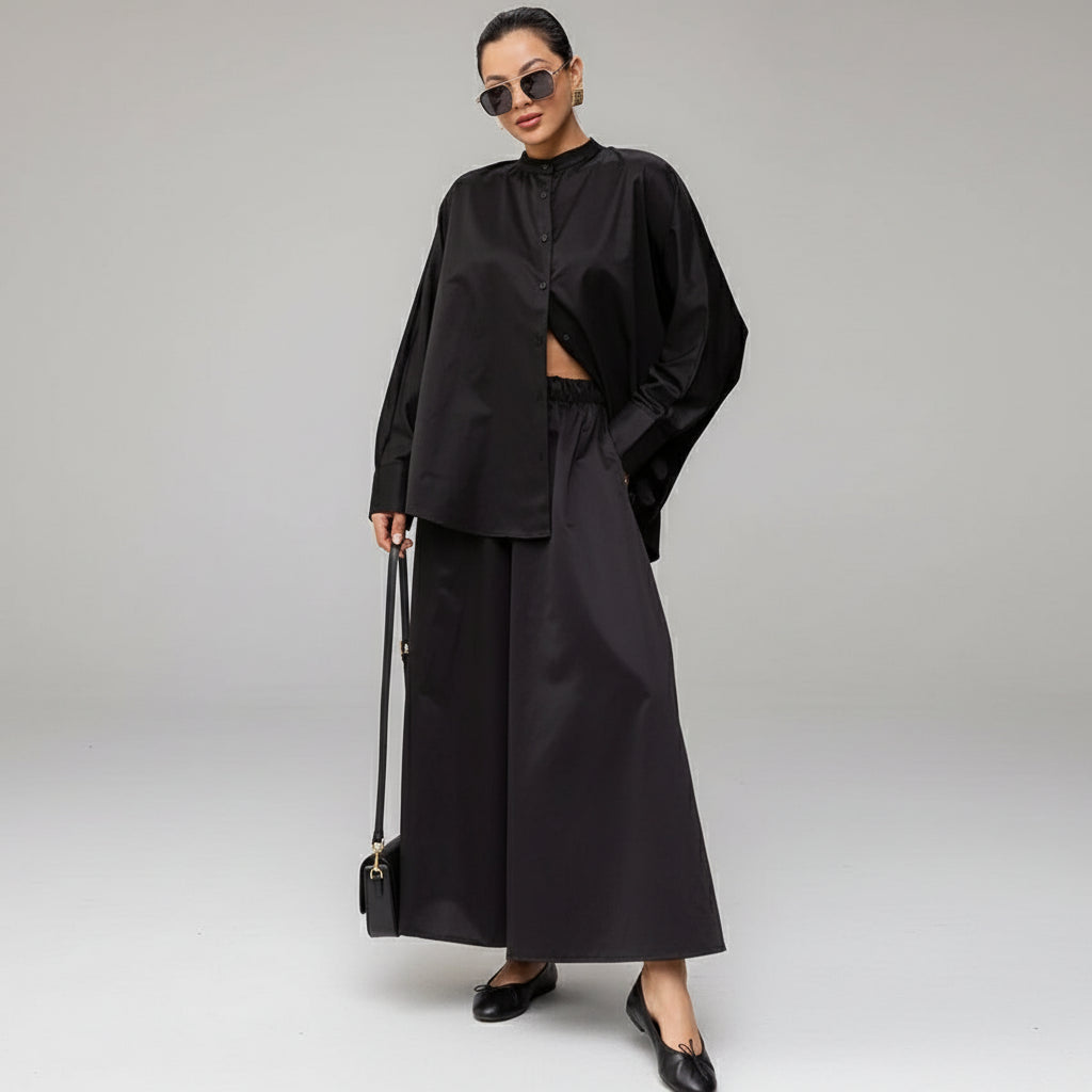 סט דו־חלקי קלאסי בסגנון Streetwear אלגנטי, כולל חולצת כפתורים ארוכה עם גזרת O-Neck ומכנסיים במותן גבוהה עם גזרה ישרה ונוחה. עשוי מבד פוליאסטר איכותי ללא מתיחה, מושלם למראה נקי ומסודר.